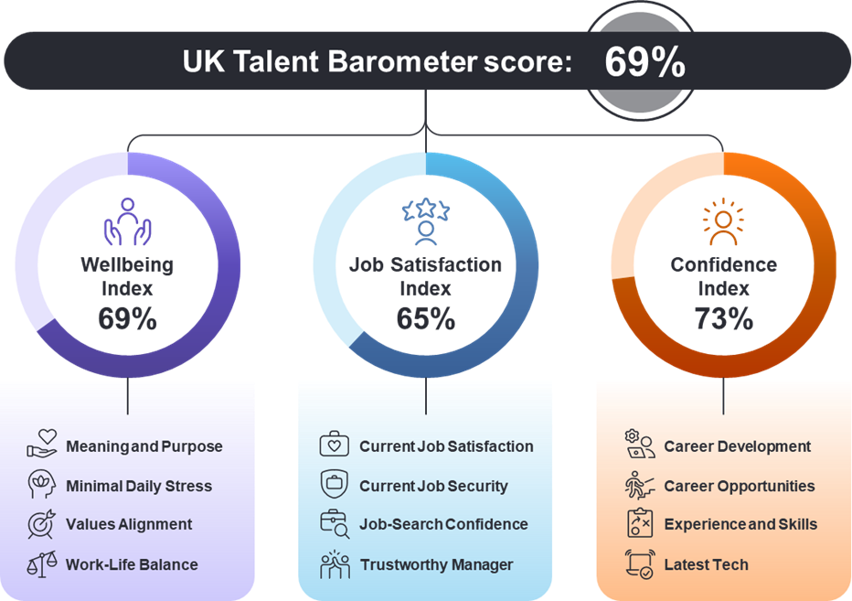 In the latest edition of the Global Talent Barometer, UK workers reported an overall score of 69% for 2026, reflecting weakened confidence as wellbeing and job satisfaction remained steady.